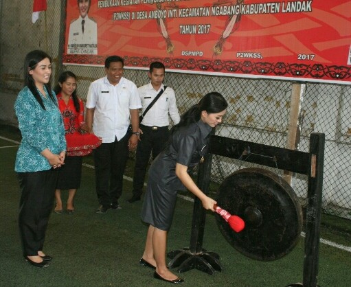 Bupati Landak Karolin memukul gong, dimulainya kegiatan P2WKSS tingkat Kabupaten Landak, di Desa Amboyo Inti, Rabu (19/07/17). (Foto: One)