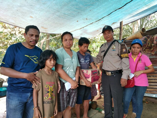 MENYUKE, LANDAKNEWS – Bhabinkamtibmas Polsek Menyuke Polres Landak Bripka Ewaldus Leo bersama Umat Katolik Santo Agustinus dan Mattias Paroki Darit, memberikan sumbangan kepada Bapak Herman korban yang rumahnya kebakaran sabtu lalu (18/8) di Dusun Ngaro Desa Tolok Kecamatan Menyuke Kabupaten Landak, Rabu (22/08/2018).