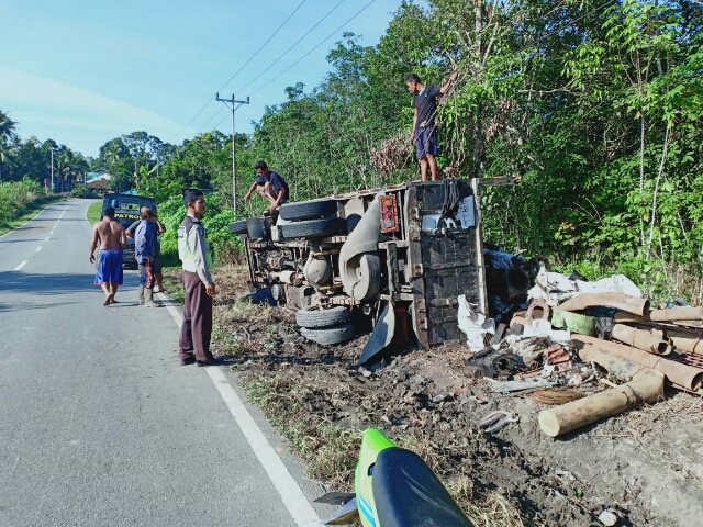 Setibaya di jalan Raya Desa Pongok Kecamatan Mandor Kabupaten Landak tiba-tiba Truk dengan nomor Polisi H 1788 FN tiba-tiba oleng,