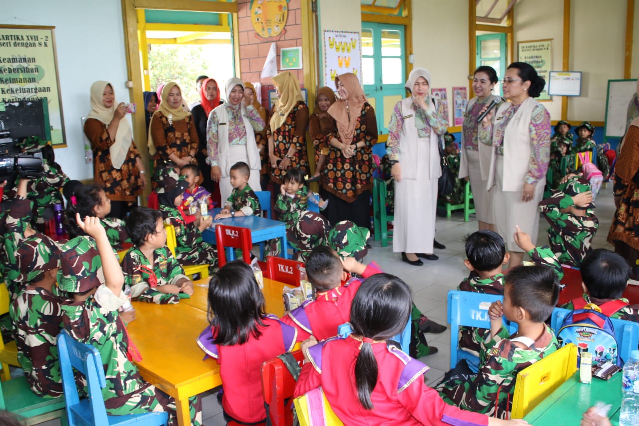 Ibu Mudi Herman Asaribab dalam kunjungan kerja mengunjungi ke TK Kartika XVII-2 merasa bangga dan senang disambut dengan atraksi Drumband dari murid-murid TK Kartkika XVII-2 dan diiringi dengan lagu anak kodok.