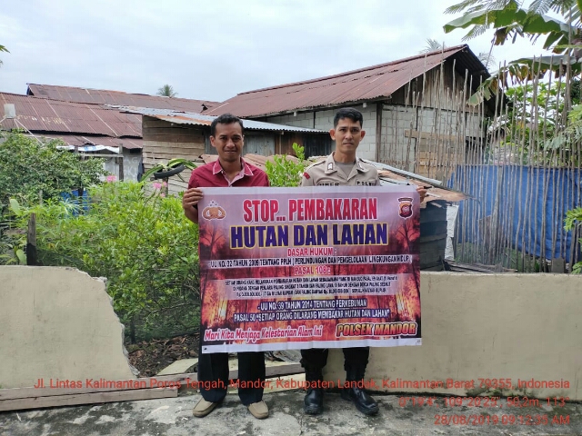 MANDOR, KALBAR – Anggota Polsek Mandor Bripka Uber mensosialisasikan Stop Pembakaran Lahan dan Hutan (Karhutla) kepada warga.Rabu(28/8).