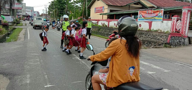 Selain melakukan penjagaan dan pengaturan arus lau lintas, demi keselamatan aparat Kepolisian juga membantu anak-anak sekolah untuk menyeberangi jalan.