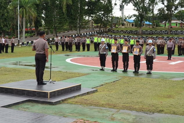 Kapolres Landak AKBP Ade Kuncoro Ridwan, S.IK yang dalam upacara bertugas sebagai Inspektur Upacara menyampaikan simpati atas diberhentikannya rekan bertugas dalam Polri