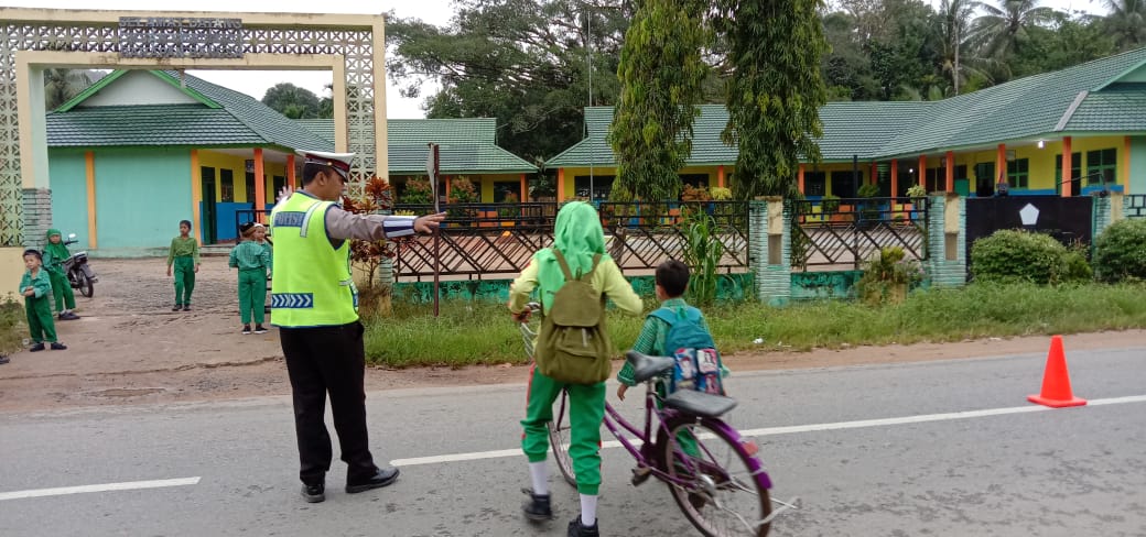 Mempawah Hulu – Personel Unit Lalu Lintas Polsek Mempawah Hulu setiap pagi melakukan pengaturan arus lalu lintas sekaligus membantu menyeberangkan anak-anak sekolah yang berangkat ke sekolah guna mengikuti proses belajar mengajar, Rabu (26/02/2020).