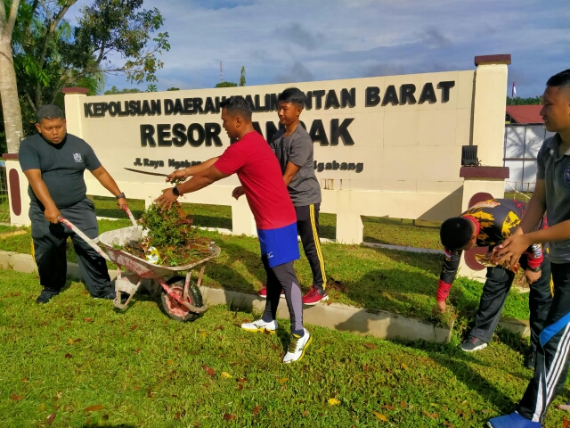 Waka Polres Landak Kompol Herman Setiadi, S.IK memimpin anggota Polres Landak untuk melaksanakan bersih-bersih lingkungan atau yang akrab disebut “korve” di sekitaran Kantor Polres Landak