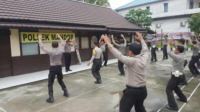 Setelah pelaksanaan Apel Pagi, Kapolsek Mandor IPTU Anuar Syarifudin di dampingi IPDA Sudarsum memimpin gerakan senam untuk menjaga kesehatan dan fitalitas tubuh yang diikuti Personil Polsek Mandor.