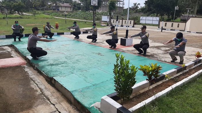 MERANTI – Guna menambah daya tahan tubuh menjadi sehat dan kuat, Personel Polsek Meranti kembali melaksanakan senam Kebugaran dihalaman Mako Polsek Meranti, senin pagi (30/03/2020).