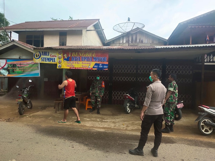 MENYUKE- Anggota Polsek Menyuke Polres Landak Briptu Efdi melaksanakan Kegiatan pengawalan Penyemprotan Penanganan Virus Corona (Covid-19), Minggu (05-04-2020).