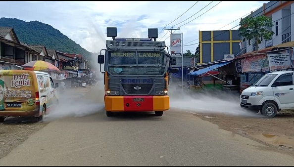 SENGAH TEMILA – Upaya Polri untuk memerangi penyebaran Virus Corona Covid-19, di Kecamatan Sengah Temila Kabupaten Landak Tim Satgas Aman Nusa II Kontijensi Penanggulangan Covid-19 Polres Landak Polsek Sengah Temila melakukan penyemprotan cairan disinfektan di sejumlah ruas jalan utama dengan menggunakan Mobil Water Canon milik sat Sabhara Polres Landak. Senin (06/04/2020).