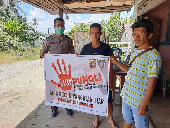 MENJALIN – Di tengah wabah covid 19 di Indonesia tidak menyurutkan semangat personil Polsek Menjalin untuk mensukseskan Program Saber Pungli di wilayah Kab Landak khususnya di wilayah hukum Polsek Menjalin, Personel Polsek Menjalin melaksanakan imbauan dan sosialisasi terkait gerakan Sapu Bersih Pungutan Liar (Saber Pungli) di Desa Bengkawe Kec Menjalin, Jumat (10/05/2020).