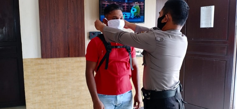 Seperti yang dilakukan oleh Kasi Humas Polsek Menjalin Bripka Rodiansyah melakukan pemakaian masker kepada warga yang datang di Mapolsek Menjalin tanpa menggunakan masker. Sabtu (15/5).
