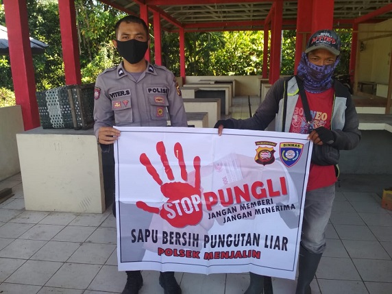 MENJALIN – Disaat Indonesia mengalami pandemi virus covid-19, Polri tetap melaksanakan kegiatan sosialisasi Saber Pungli (Sapu Bersih Pungutan Liar) guna memberikan edukasi kepada masyarakat tentang pungutan liar di instansi Pemerintah dengan menggunakan protokol pencegahan virus covid-19.