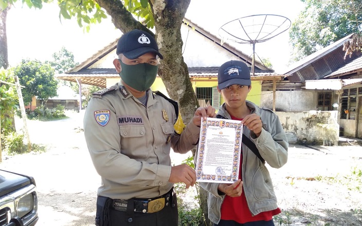MANDOR – Bhabinkamtibmas Polsek Mandor BRIPKA Muhadi menyampaikan himbauan Maklumat Kapolri, Kepada Randi di Desa Selutung Kec. Mandor Kab. Landak. Jumat (19/06/2020).