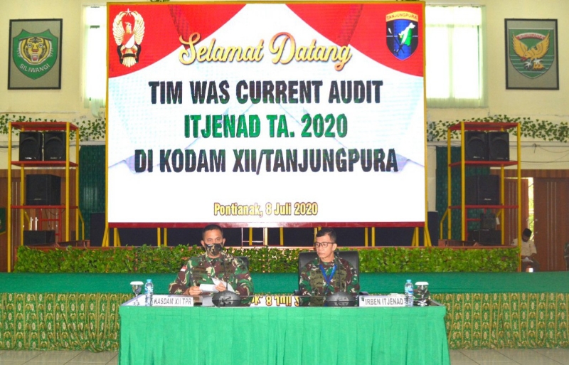 Kubu Raya, Rabu (8/7/20) – Pangdam XII/Tanjungpura, Mayjen TNI Muhammad Nur Rahmad diwakili Kasdam XII/Tpr, Brigjen TNI Alfret Denny D. Tuejeh membuka kegiatan Taklimat Awal Tim Pengawasan dan Pemeriksaan (Wasrik) Current Audit Inspektorat Jenderal (Itjenad) TA. 2020 di Aula Makodam XII/Tpr. Tim Wasrik Itjenad akan melakukan pengawasan dan pemeriksaan Program Kerja dan Anggaran di wilayah Kodam XII/Tpr.