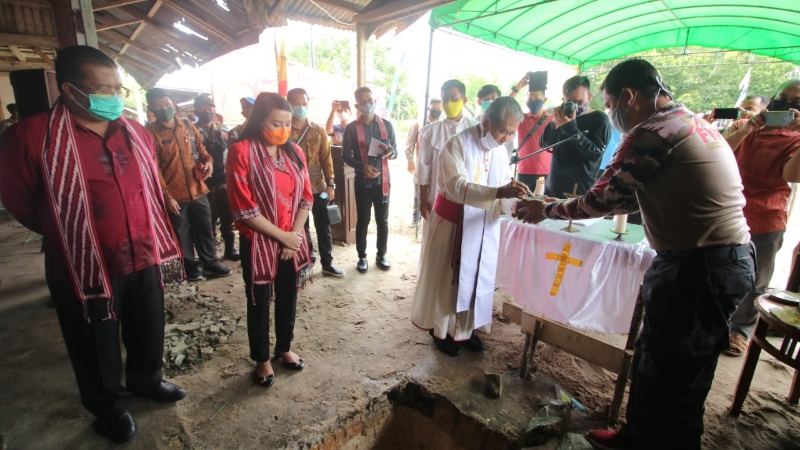 LANDAK – Bupati Landak Karolin Margret Natasa melaksanakan peletakan batu pertama pembangunan Pastoran Mandor bersama Uskup Agung Pontianak Mgr Agustinus Agus dengan didampingi Ketua DPRD Landak Heri Saman, Wakil Ketua DPRD Landak Lamri, Anggota DPRD Landak Margaretha, Sekretaris Daerah Landak dan Forkopimcam Mandor, Jum’at (10/07/20).