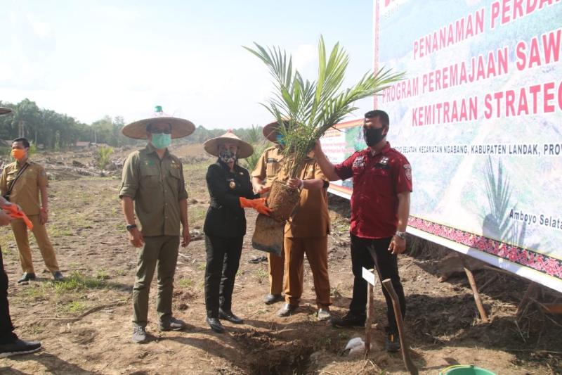 LANDAK- Bupati Landak dr. Karolin Margret Natasa secara langsung melaksanakan penanaman perdana peremajaan sawit rakyat dusun seluang danau di lokasi Koperasi serba usaha harapan kita plasma 8 desa amboyo selatan, Kecamatan Ngabang, Senin (10/08/20).