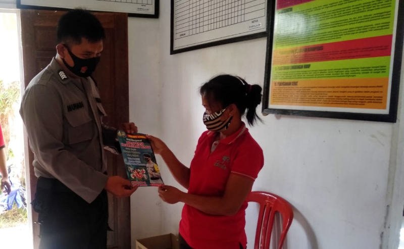 MANDOR – Bhabinkamtibmas Polsek Mandor BRIPKA Muhadi menyampaikan himbauan Tentang Adaptasi Kebiasaan Baru, kepada Masalina. di Desa Selutung Kecamatan Mandor Kabupaten Landak.