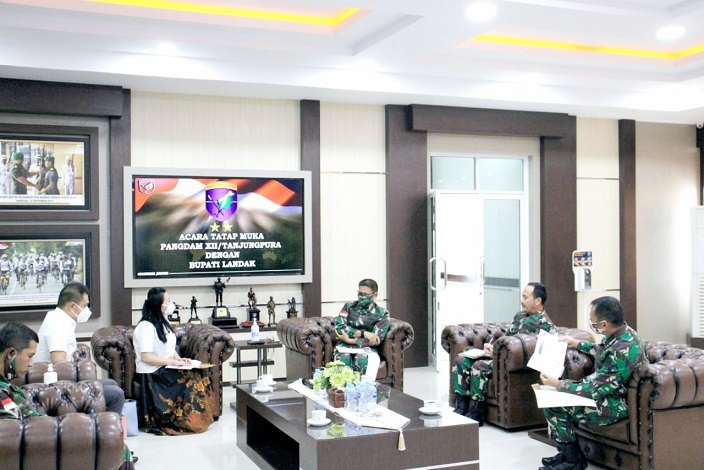 Kubu Raya, Senin (7/9/20) – Panglima Kodam XII/Tanjungpura, Mayjen TNI Muhammad Nur Rahmad menerima kunjungan dari Bupati Landak, dr. Karolin Margret Natasa di Ruang Koridor, Gedung A Makodam XII/Tpr.