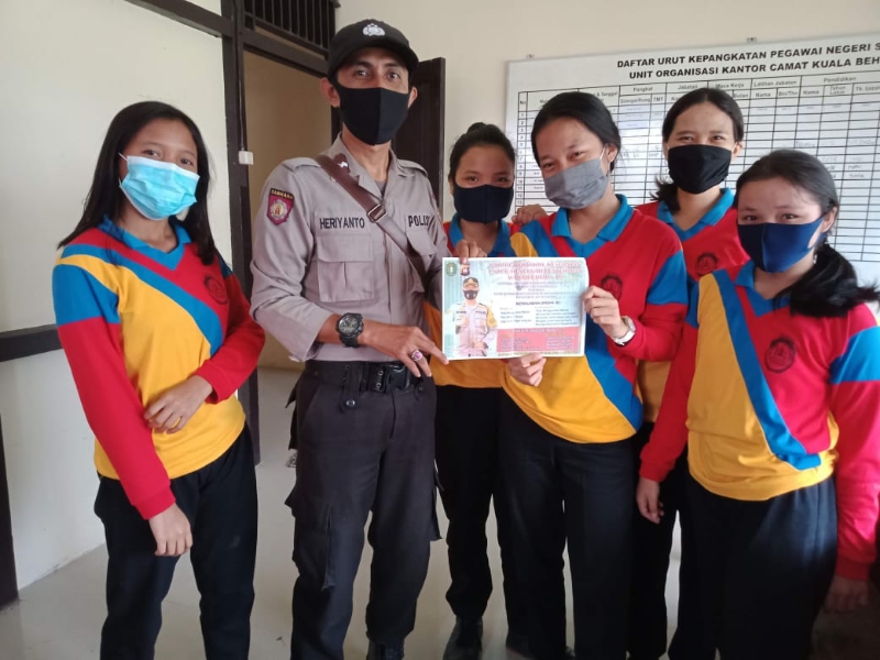 KUALA BEHE-Sebagai upaya dalam mencegah penyebaran virus Covid 19, Anggota Polsek Kuala Behe Aipda Heriyanto mengajak Warganya untuk mensosialisasikan Era New Normal atau tatanan hidup era baru ditengah Pandemi Covid–19 dengan memperhatikan beberapa protokol kesehatan dan juga terima kasih kepada Pelajar yang telah memakai masker sesuai standar Protokol Kesehatan Jumat (18/9/2020)