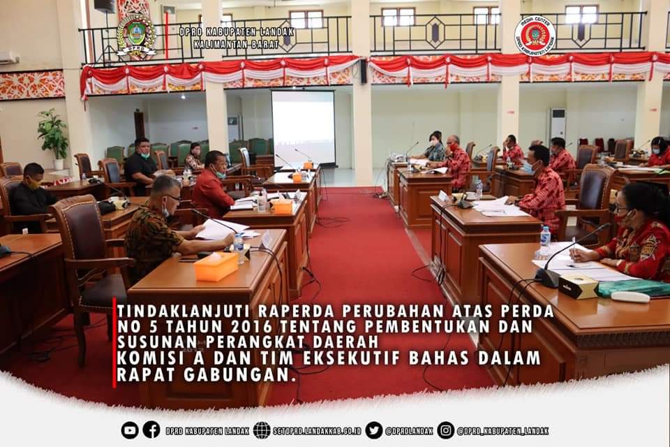 LANDAK – Komisi A Dewan Perwakilan Rakyat Daerah (DPRD) Kabupaten Landak kembali menggelar rapat gabungan bersama Tim Eksekutif dalam menindaklanjuti Raperda Perubahan atas Perda No 5 Tahun 2016 tentang Pembentukan dan Susunan Perangkat Daerah khususnya di wilayah Kabupaten Landak. Jum’at (9/10/2020).