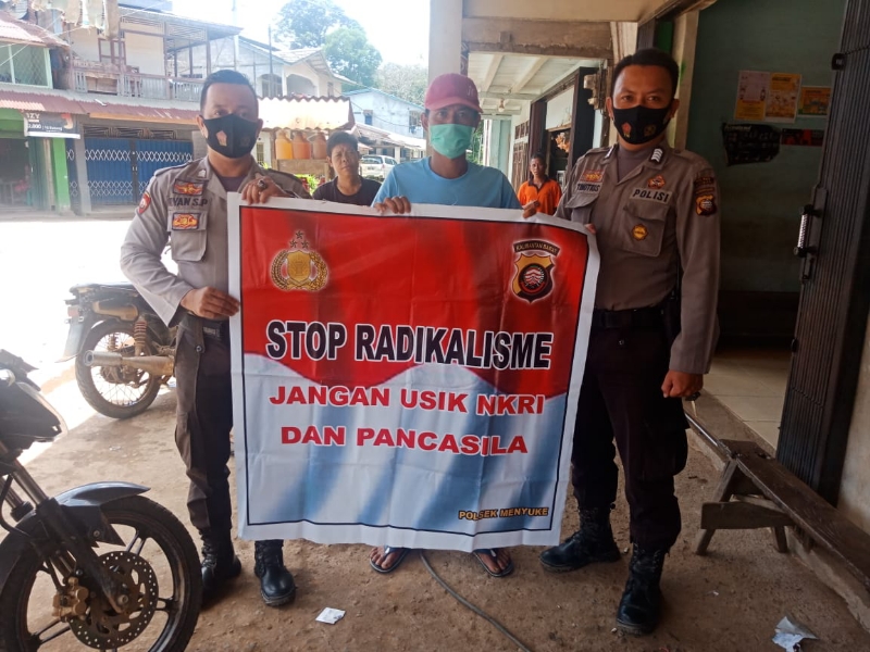 MENYUKE – Mencegah berkembangnya paham radikalisme Anggota Sabhara Polsek Menyuke Bripka Rian Sukma Putra dan Bripka Timotius Niko membentang spanduk bukti bersama warga bahwa warga masyarakat Kecamatan Menyuke akan menolak berkembangnya paham tersebut, Sabtu (10/10/2020) siang.