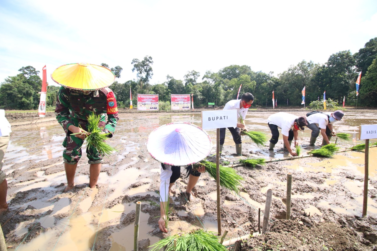 LANDAK – Bupati Landak Karolin Margret Natasa melakukan tanam perdana padi varietas unggul Inpari 42 di Desa Serimbu, Kecamatan Air Besar, rabu (21/10/20) dengan didampingi Dandim 1201/Mempawah, Kepala Dinas Pertanian, Perikanan dan Ketahanan Pangan kabupaten Landak, Camat Air Besar bersama Kelompok Tani dan masyarakat.