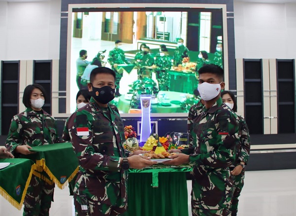 Syukuran ditandai dengan pemotongan tumpeng oleh Mayjen TNI Muhammad Nur Rahmad yang diserahkan kepada Prajurit Berprestasi, Prada Musa dari Yonif 643/Wns.