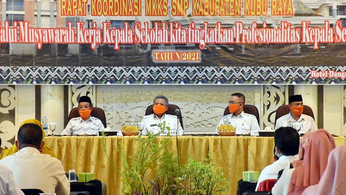 PROKOPIM KUBU RAYA – Bupati Kubu Raya Muda Mahendrawan membuka Rapat Koordinasi Musyawarah Kerja Kepala Sekolah (MKKS) Sekolah Menengah Pertama (SMP) Kabupaten Kubu Raya di Hotel Dangau Kubu Raya, Rabu (13/1). Dalam sambutannya ia mengingatkan kepala sekolah yang juga sebagai tenaga pendidik untuk terus meningkatkan kualitas diri. Caranya dengan tetap menjadi pembelajar.