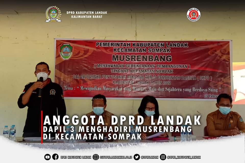 Kegiatan tersebut berlangsung di Aula BP2K Sompak Musrenbang dipimpin oleh Camat Sompak Marcel Benny, dihadiri Anggota DPRD Landak Dapil 3 Yanto Mardino, Bupati Landak yang di wakili oleh Asisten Administrasi Umum Theresia Limawardani serta Bappeda Landak Supermin Dinas Pendidikan Buyung, Dinas PUPR PERA Jamelius, Dinas P3AKB Paolip, Dinas Pertanian Perikanan dan Ketahanan Pangan Florentinus Supriyadi, Dinas Kesehatan Sri Supartinah, Dinas Pariwisata Antonius Dalawi, Kapolsek Mempawah Hulu, Danramil Mempawah Hulu Kepala Puskesmas Sompak, Kepala Desa, Se-Kecamatan Sompak, Anggota BPD, Tokoh Masyarakat, PGRI dan undangan lainnya. Senin (15/2/2021).