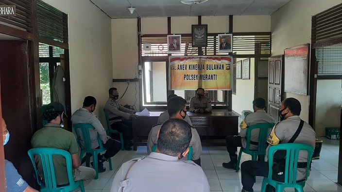 Anev kinerja bulanan yang dimulai pada pukul 08.30 Wib setelah apel pagi tersebut tetap dilaksanakan dengan protokol Covid-19, yang dipimpin langsung oleh Kapolsek Meranti IPDA Hendra Setyawan, AMd. dan diikuti oleh para Kanit, Kasi beserta anggota Polsek Meranti.