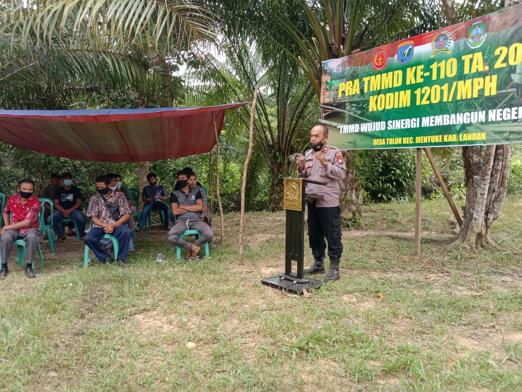 Hadir dalam kegiatan Pra TMMD ke 110 Ta 2021 di antaranya Dandim 1201/Mampawah Letkol Infantri Dwi Agung Prihannto S.sos M.Tr, Camat menyuke, Bapak Apen tinus Danramil 1201-10 menyuke Lettu Infantri Ari Cahyono, Kapolsek Menyuke Iptu Dahman Saragih, Humas PT.PAS Bapak Jhonatus, Kepala puskesmas Darit Bapak Edy Str, Kepala desa Tolok Bapak Supardi dan Tokoh masyarakat, adat, agama dan tokoh pemuda desa tolok.