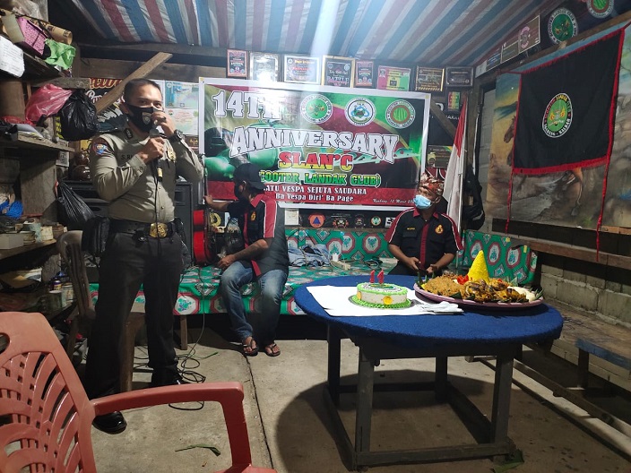 NGABANG – Binmas Polres Landak Aipda Suriansyah selaku Ps. Kanit Bintibmas didampingi Bripka Diwan Saputra sambangi Club motor yang bernama Scooter Landak Club (Slan’c) yang sedang merayakan anniversary ke 14 di Pal. 6, Desa. Amboyo Inti, Kecamatan Ngabang. Sabtu (13/3/2021)