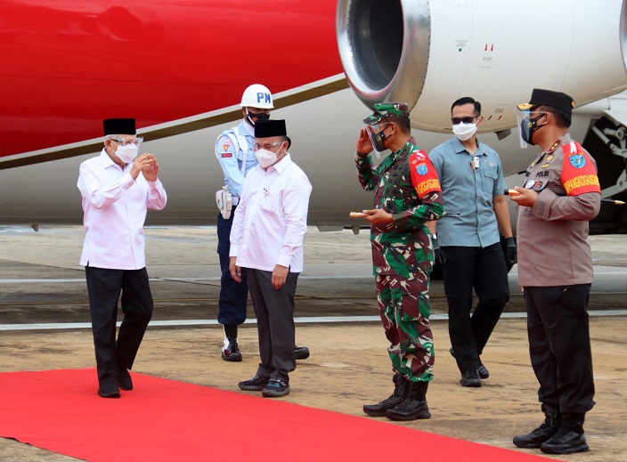 Palangka Raya, Selasa (30/3/21) – Panglima Kodam XII/Tanjungpura, Mayjen TNI Muhammad Nur Rahmad bersama Forkopimda Provinsi Kalimantan Tengah menyambut kedatangan Wakil Presiden Republik Indonesia, Prof. Dr. K. H. Ma’ruf Amin serta rombongan di Bandara Tjilik Riwut, Kota Palangka Raya.