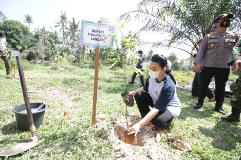 LANDAK – Bupati Landak Karolin Margret Natasa mengikuti peringatan hari air sedunia tahun dengan melaksanakan penanaman pohon jenis matoa, jambu, lengkeng, rambutan, mangga, sawo dengan total sekitar 500 batang dan penebaran bibit ikan nila sebanyak 5000 ekor bersama Balai Wilayah Sungai Kalimantan I Pontianak Provinsi Kalimantan Barat dan Komunitas Lindungi Hutan Landak di kawasan makam juang mandor, Kecamata Mandor, Kabupaten Landak, selasa (06/03/21).