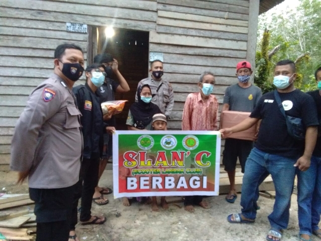 Bansos komunitas motor scooter ini di pimpin oleh Suwono selaku penasehat Club dan di ikuti oleh 10 anggota Slan’C serta di dampingi oleh Aipda Suriansyah selaku Ps. Kanit Bintibsos, Bripka Diwan Saputra selaku Ps. Kanit Binkamsa dan Bripda Ardi Ardiansyah selaku staf Binmas Polres Landak.