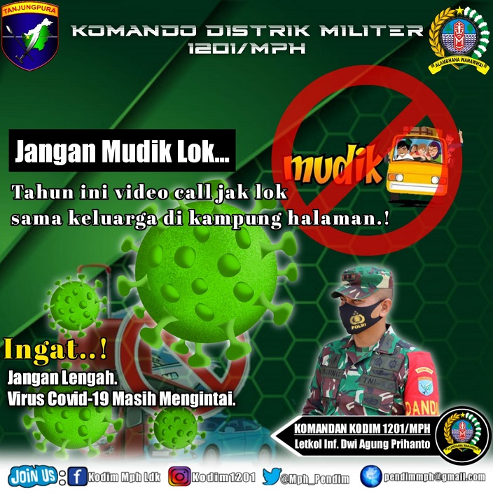 LANDAK (LANDAK NEWS) – Ditengah maraknya penyebaran virus corona, Dandim 1201/Mph Letkol Inf. Dwi Agung Prihanto, S.Sos., M.Tr(Han) menghimbau warga Kabupaten Mempawah dan Landak khususnya anggota Kodim 1201/Mph, untuk mematuhi imbauan pemerintah dengan tidak mudik pada hari raya Idul Fitri tahun ini, Senin (3/5/2021).