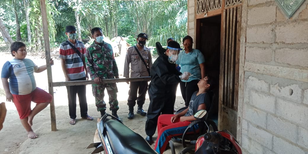 Pengambilan sampel spesimen Swab test ini dilakukan di rumah warga di dusun Raden Desa Paloan yang diduga kontak erat dengan penderita.