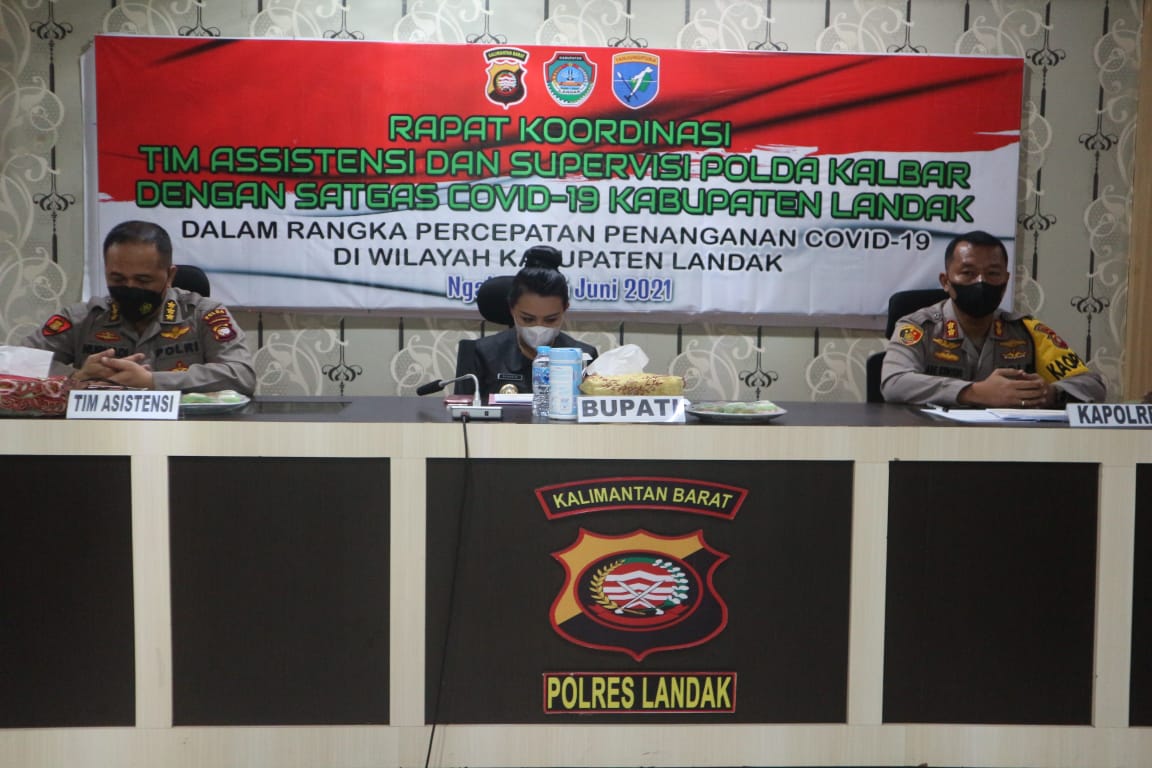 NGABANG- Polres Landak laksanakan Rapatolres Landak, Kapolres Landak AKBP Ade Kuncoro Ridwan, S.I.K pimpin pelaksanaan rapat koordinasi Tim Assistensi dan Supervisi Polda Kalbar Dengan Satgas Covid-19 dalam rangka percepatan penanganan Covid-19 di wilayah Kabupaten Landak di ruang BKPM Polres Landak. Senin (14/6/2021)