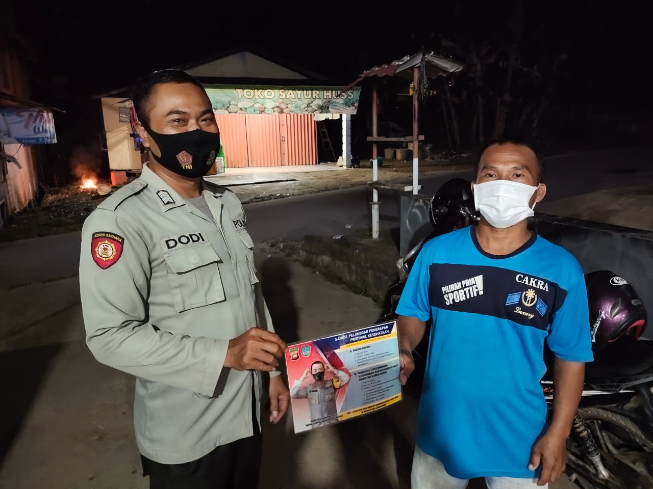 Menyuke – Di saat malam hari yang di lakukan oleh Personil Polsek Menyuke Polres Landak mensosialisasikan Protokol Kesehatan dalam Pencegahan Penyebaran Virus Corona atau Virus Covid-19 ke Wilayah Kecamatan Menyuke Kabupaten Landak, Kamis (24/06/1), malam.