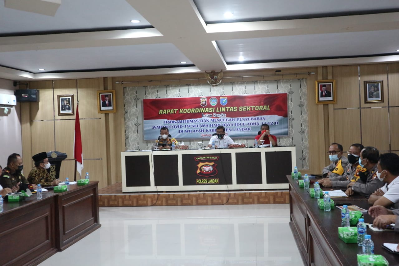 Ngabang – AKBP Ade Kuncoro Ridwan,S.I.K selaku Kapolres Landak pimpin pelaksanaan rapat koordinasi lintas sektoral dalam rangka Harkamtibmas dan mencegah penyebaran wabah Covid-19 selama hari raya Idul Adha 1442 H di wilayah Kabupaten Landak. Rabu (14/7/2021)