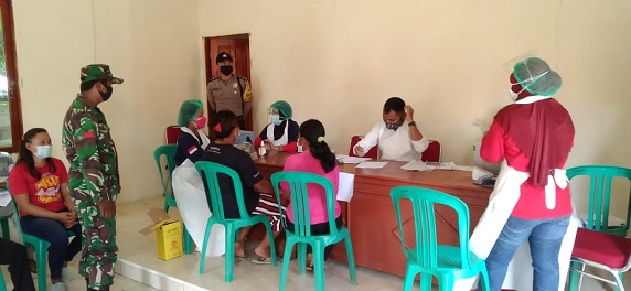 Meranti – 3 orang Anggota Bhabinkamtibmas Polsek Meranti bersama Camat Meranti Elly Cornelia, S.H. memantau kembali sekaligus mengamankan Vaksinasi Covid-19 massal Tahap II Termen III Dosis Ke 1 untuk Wilayah Kerja Puskesmas Meranti yang dilaksanakan di kantor Desa Kelampai Setolo Kecamatan Meranti Kabupaten Landak. Rabu ( 21/07/21 ).