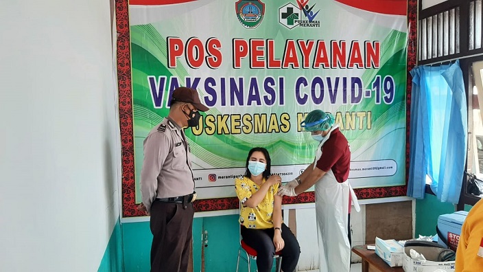 Meranti, Landak – Kanit Binmas Polsek Meranti Aipda Uray Zulfaqar, S.H. memantau sekaligus mengamankan Vaksinasi Covid-19 massal Tahap II Termen III Dosis Ke 1 dan Dosis ke 2 untuk Wilayah Kerja Puskesmas Meranti yang dilaksanakan di aula Puskesmas Meranti. Jumat ( 30/07/2021 ).