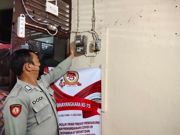 Menyuke, Landak – Saat Malam Hari Kanit Binmas Polsek Menyuke Polres Landak Bripka Dodi melakukan pengecekan dan mengawasi instalasi Listrik Untuk mengantisipasi kejadian Kebakaran di Mako Polsek Menyuke, Senin (02/08/2021) Malam.