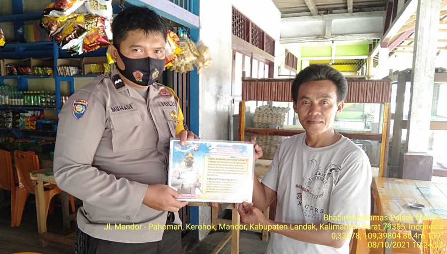 Polres Landak, Mandor –Bhabinkamtibmas Polsek Mandor AIPDA Muhadi mensosialisasikan Himbauan Kapolres Landak tentang Instruksi Bupati Landak Nomor 644 Tahun 2021 Tentang Perpanjangan PPKM Level 3 Untuk Pengendalian Covid-19, disampaikan kepada Amirius, di Desa Pongok Kecamatan Mandor Kabupaten Landak. Jumat, (08/10/21).