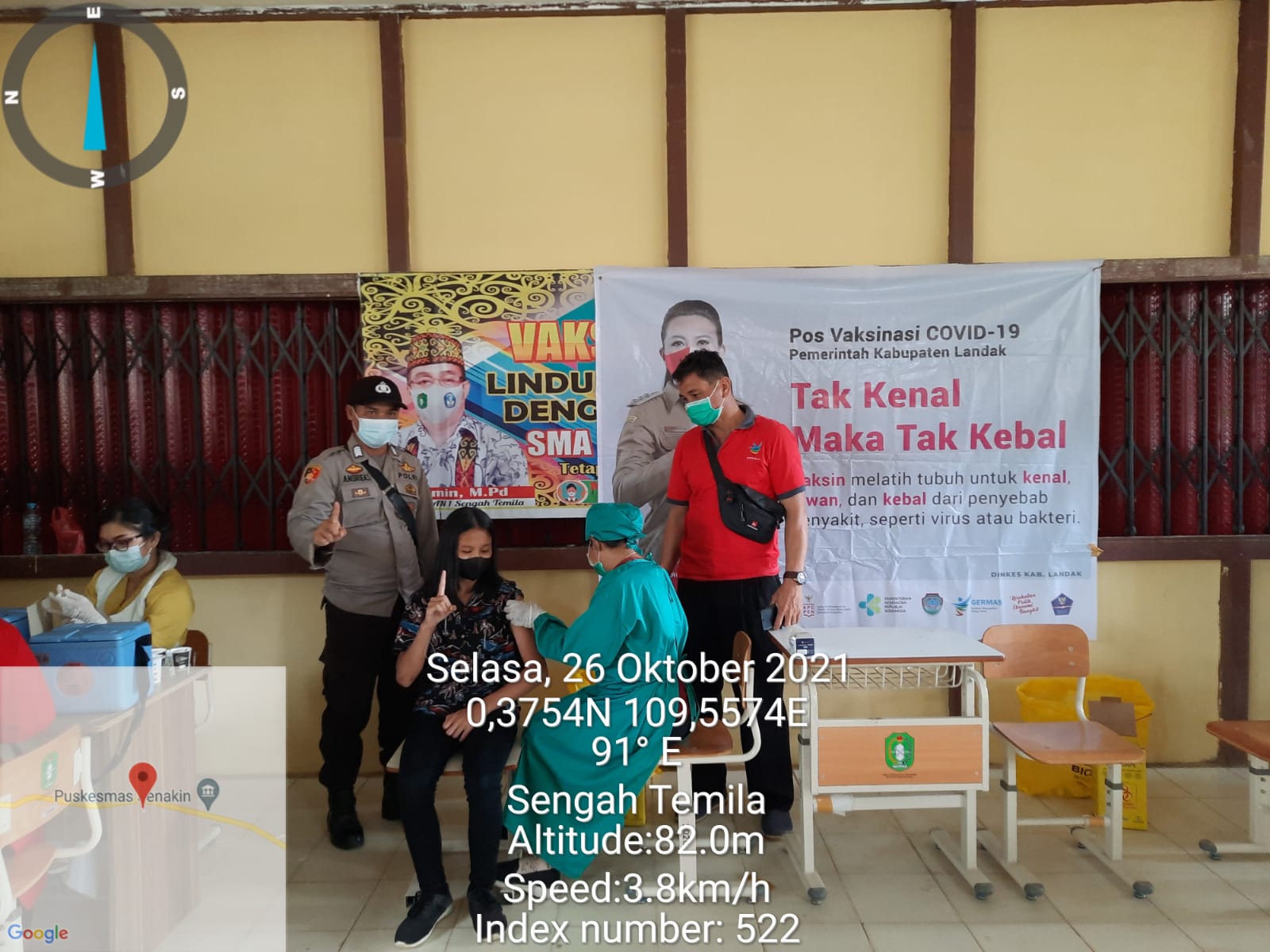 Pahuman, Landak – Polsek Sengah Temila, Ratusan Pelajar SMA Negeri 1 Sengah Temila menjalani vaksinasi Covid-19 dosis pertama di ruang kelas SMA Negeri 1 Sengah Temila. Selasa (26/10/21).