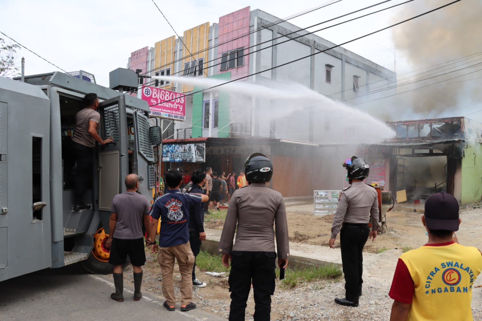Sesampainya di TKP, AWC Polres Landak bersama unit Damkar BPBD Kabupaten Landak, Damkar Yayasan Hati Suci Ngabang, Damkar Yayasan Bakti Suci, BPASN Bakti Sentosa dan Damkar Satpol PP Kabupaten Landak langsung beraksi menjinakan Si Jago Merah.