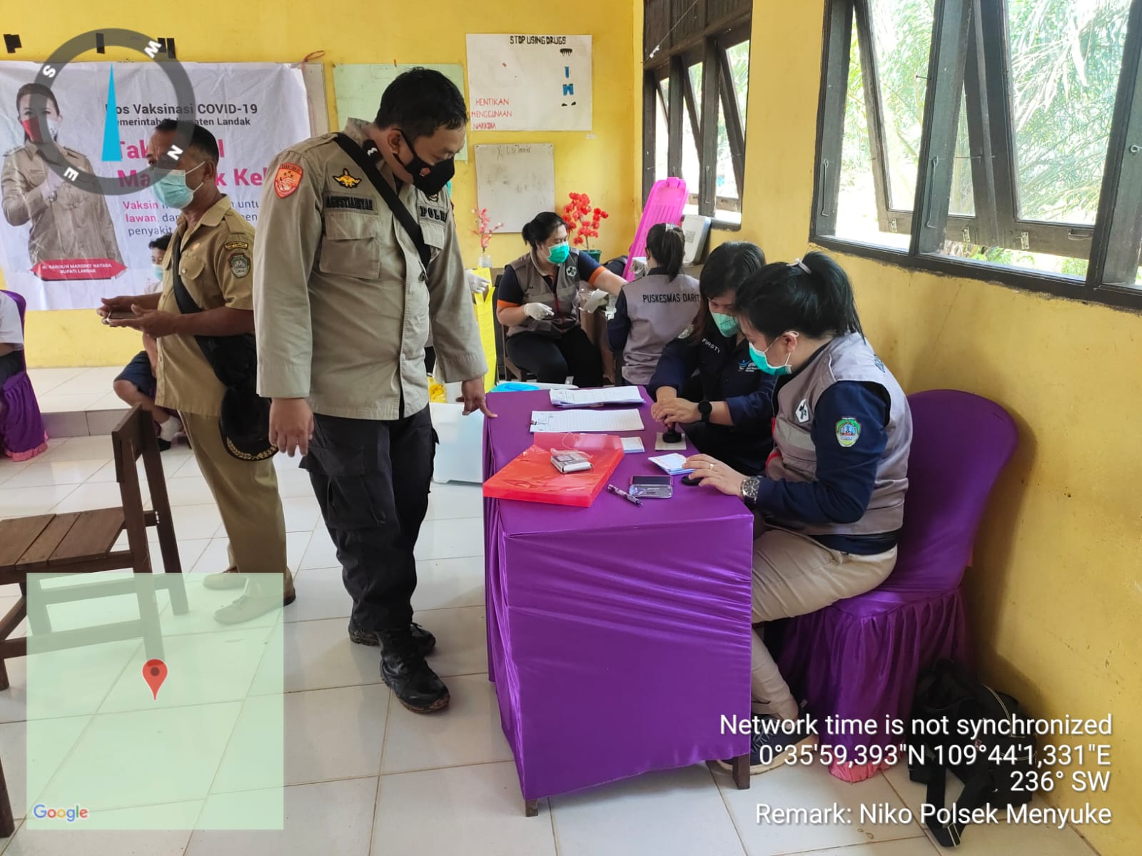 Kegiatan Vaksinasi di Gedung SMPN 06 di Desa Tolok Kecamatan Menyuke langsung di pantau oleh Kepala Puskesmas Darit yang di wakili oleh Dr. Gindo Parulian Manalu, Kepala Desa Tolok Bapak Supardi, Kepala Sekolah SMPN 06 Tolok Bapak Rodi S.Pd, Petugas Vaksinasi dari Puskemas Darit yang berjumlah 14 orang dan Personil TNI Polri yang melakukan pemgamanan di antaranya Aipda Agustiansyah, Bripka Yoyok, Bripka Timotius Niko dan Sertu Arsel.