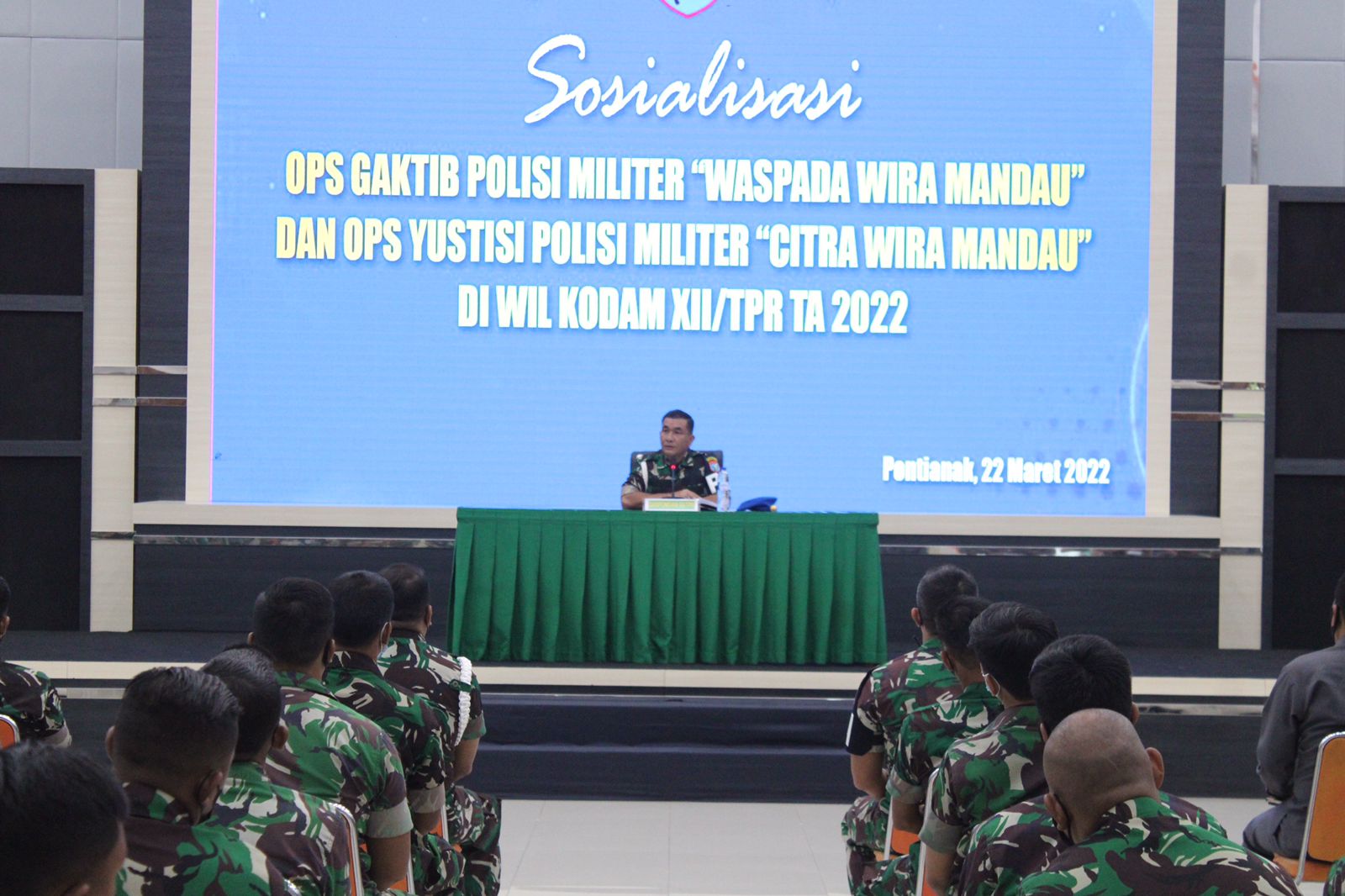 Kubu Raya, Selasa (22/3/22) – Guna meningkatkan disiplin dan mengeliminir terjadinya pelanggaran oleh Prajurit, Polisi Militer Kodam (Pomdam) XII/Tpr melaksanakan sosialisasi Operasi Gaktib dan Operasi Yustisi Polisi Militer TA 2022 di Aula Sudirman, Makodam XII/Tpr. Sosialisasi dibuka langsung oleh Danpomdam XII/Tpr, Letkol Cpm Henry, S.P. Simanjuntak, S.H., M.Hum.