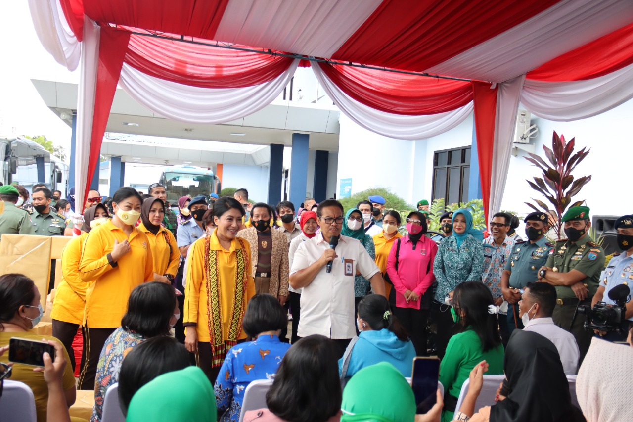Kemudian Ketua Umum Dharma Pertiwi dan Kepala BKKBN didampingi para Pengurus Dharma Pertiwi Daerah L juga melepas keberangkatan Tim Baksos yaitu para Babinsa, Babinpotmar, Babinpotdirga dan Bhabinkamtibmas untuk mendistribusikan bantuan ke wilayah binaannya masing-masing.
