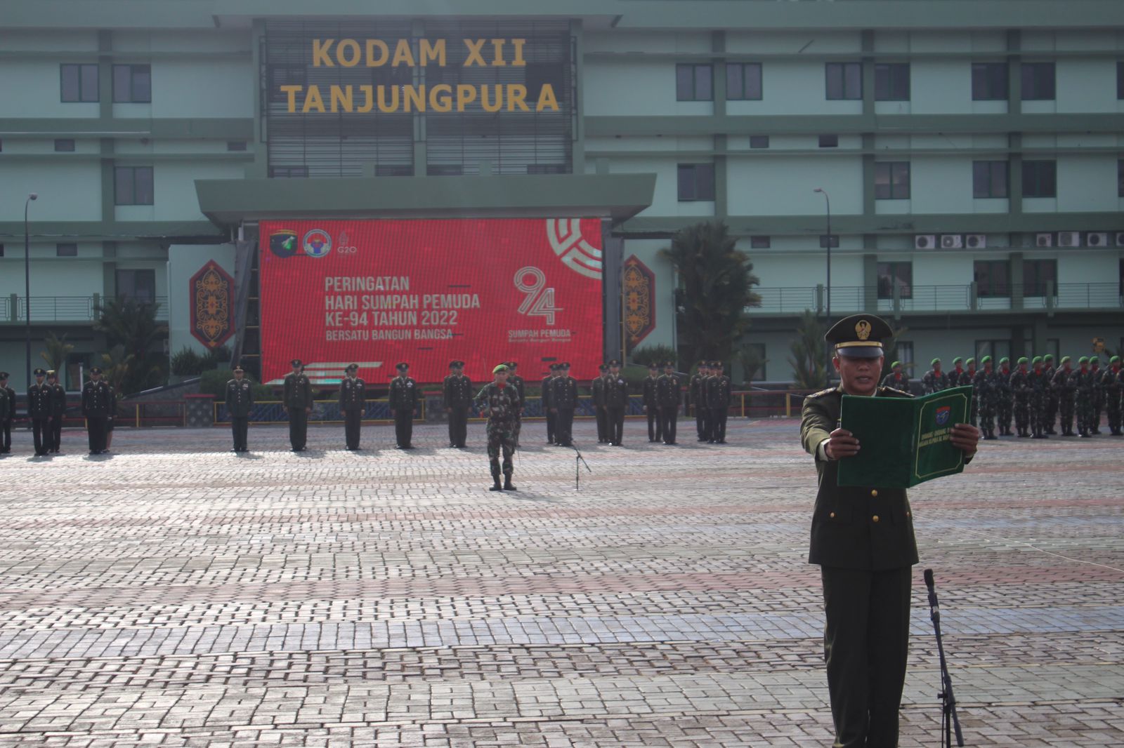 Upacara peringatan Hari Sumpah Pemuda di Makodam XII/Tpr diikuti oleh para Prajurit dan Pegawai Negeri Sipil se-garnizun Pontianak. Tema yang diusung dalam peringatan Hari Sumpah Pemuda ke-94 tahun 2022 kali ini adalah “Bersatu Bangun Bangsa”.